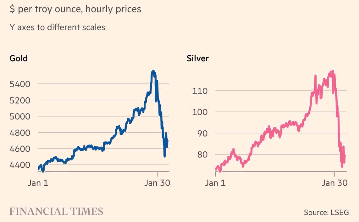 Le 30 janvier, le président Trump annonce la nomination de Kevin Warsh comme prochain président de la Fed. Cet ancien gouverneur d’une banque fédérale, économiste de formation, est un choix qui rassure les marchés sur la stabilité monétaire. Warsh incarne une politique plus disciplinée, et est perçu comme un candidat crédible pour le poste qu’il prendra en mai. La crainte d’instabilité monétaire recule, ce qui renforce le dollar et incite à la prise de bénéfices sur l’or et l’argent, actifs qui ne produisent aucun rendement, aucun revenu régulier.